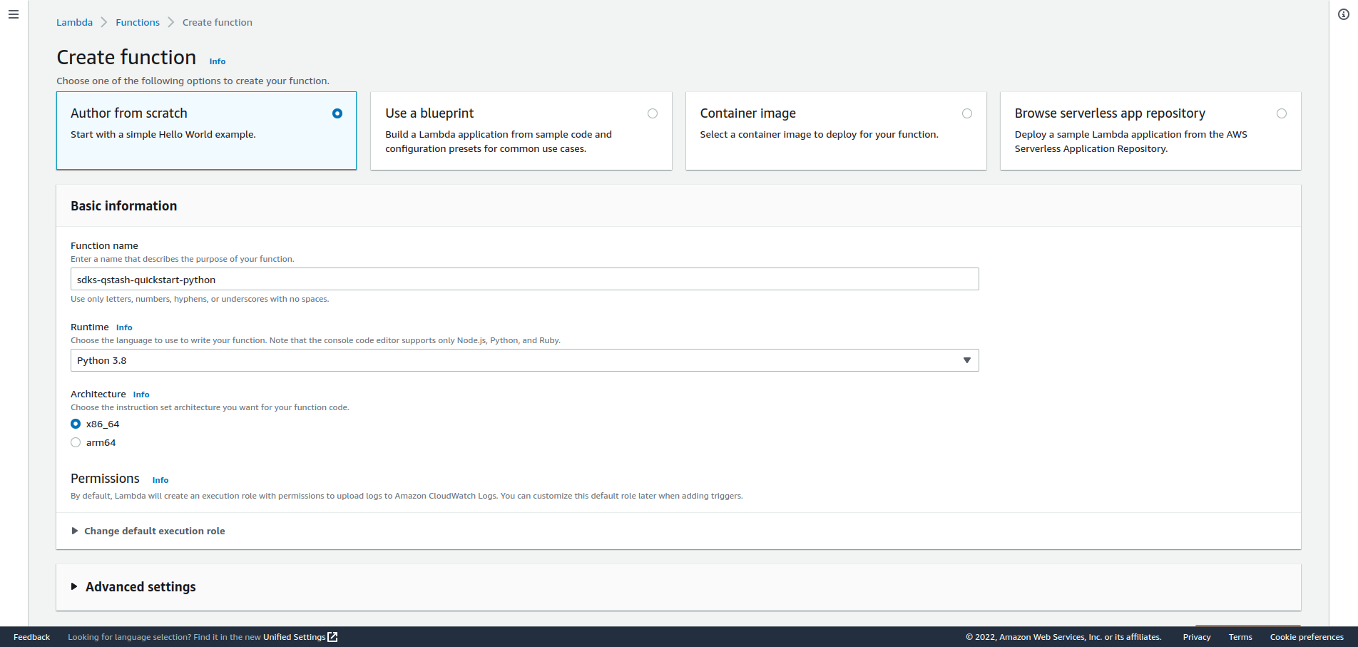 Create a new Lambda function from scratch by going to the AWS console. (Make sure you select your desired region) Give it a name and selectPython 3.8 as runtime, then create the function.