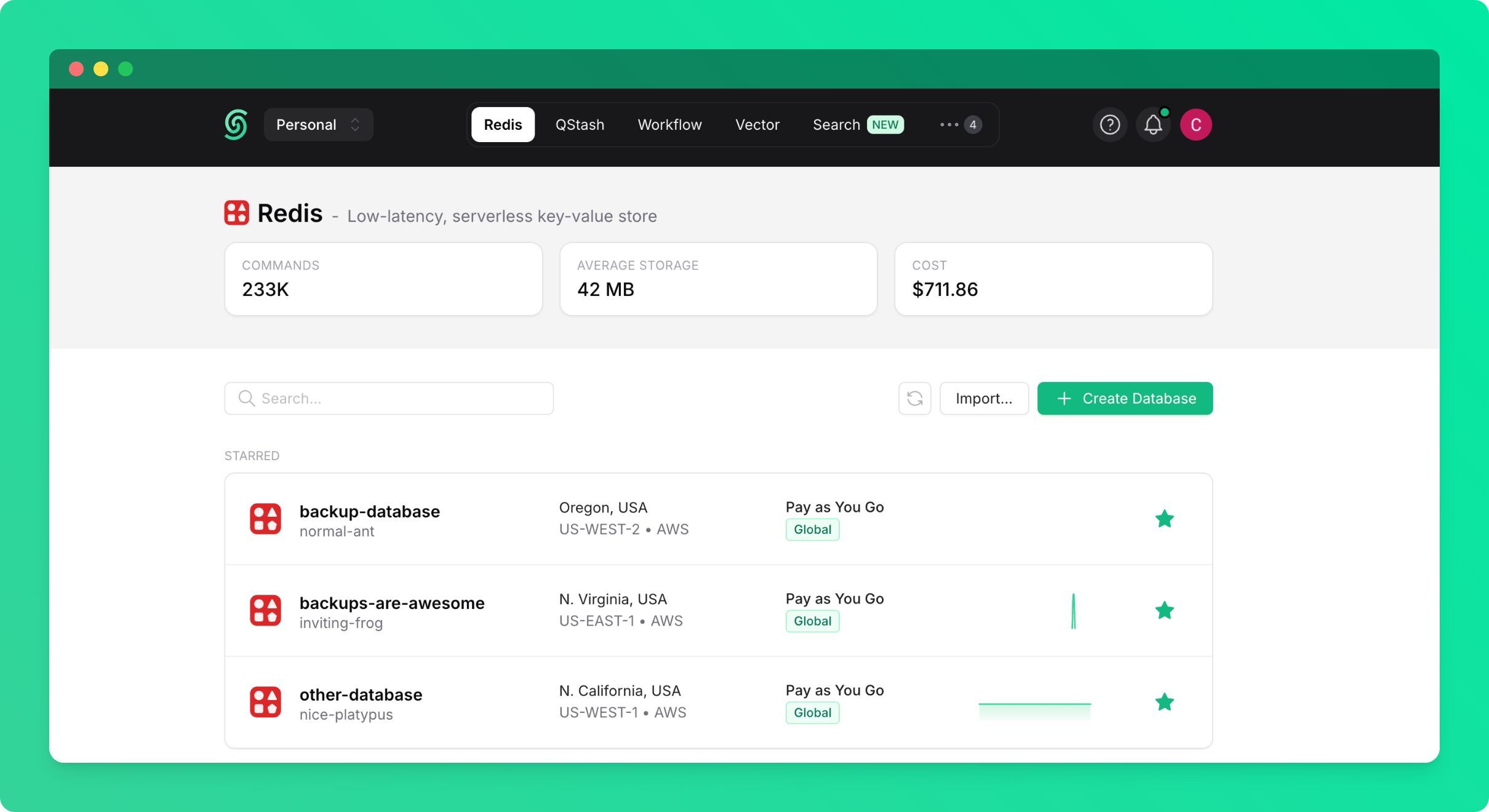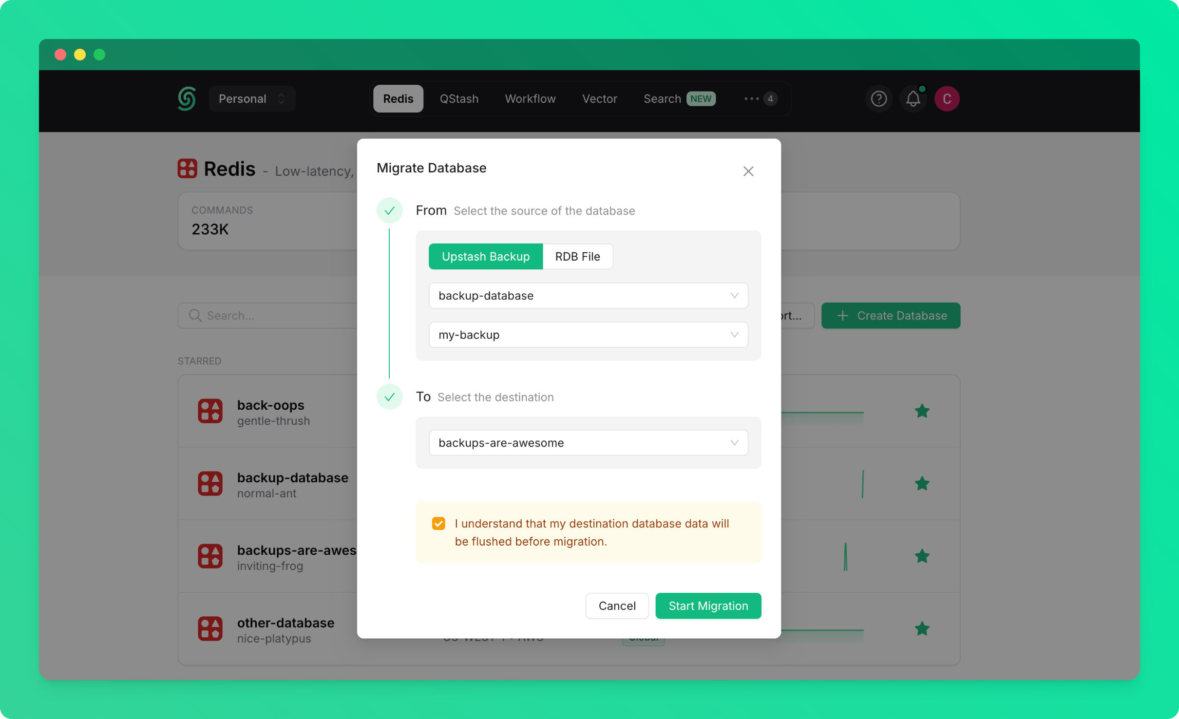 To begin importing data:- Go to the Redis database list page in the Upstash console