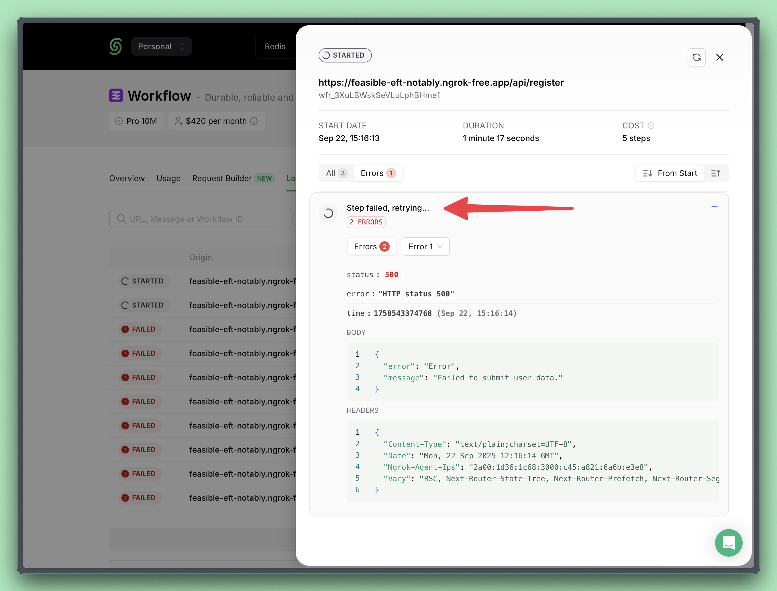 When a step fails, Upstash Workflow automatically retries the failed step with configurable retry attempts and delay strategy. This allows temporary issues to resolve without manual intervention.