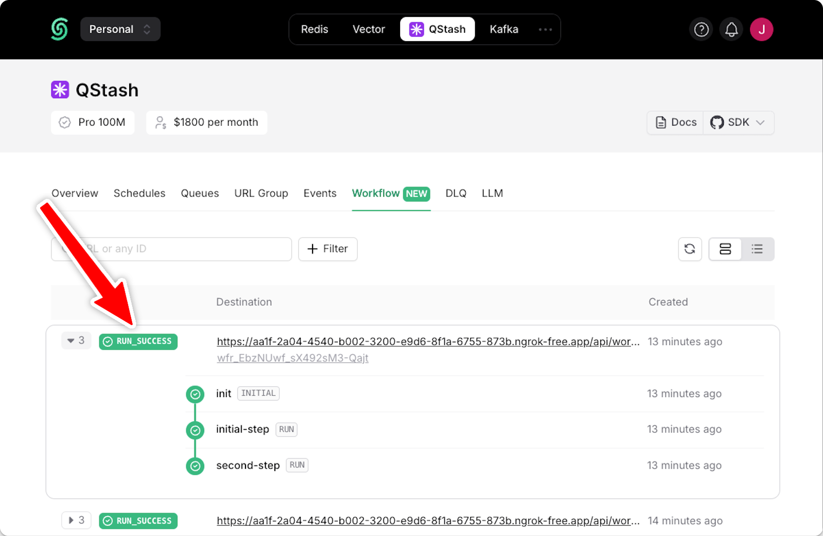 - Monitor in QStash Dashboard: Use the QStash dashboard to monitor your production workflows. You can track workflow runs, view step statuses, and access detailed logs.